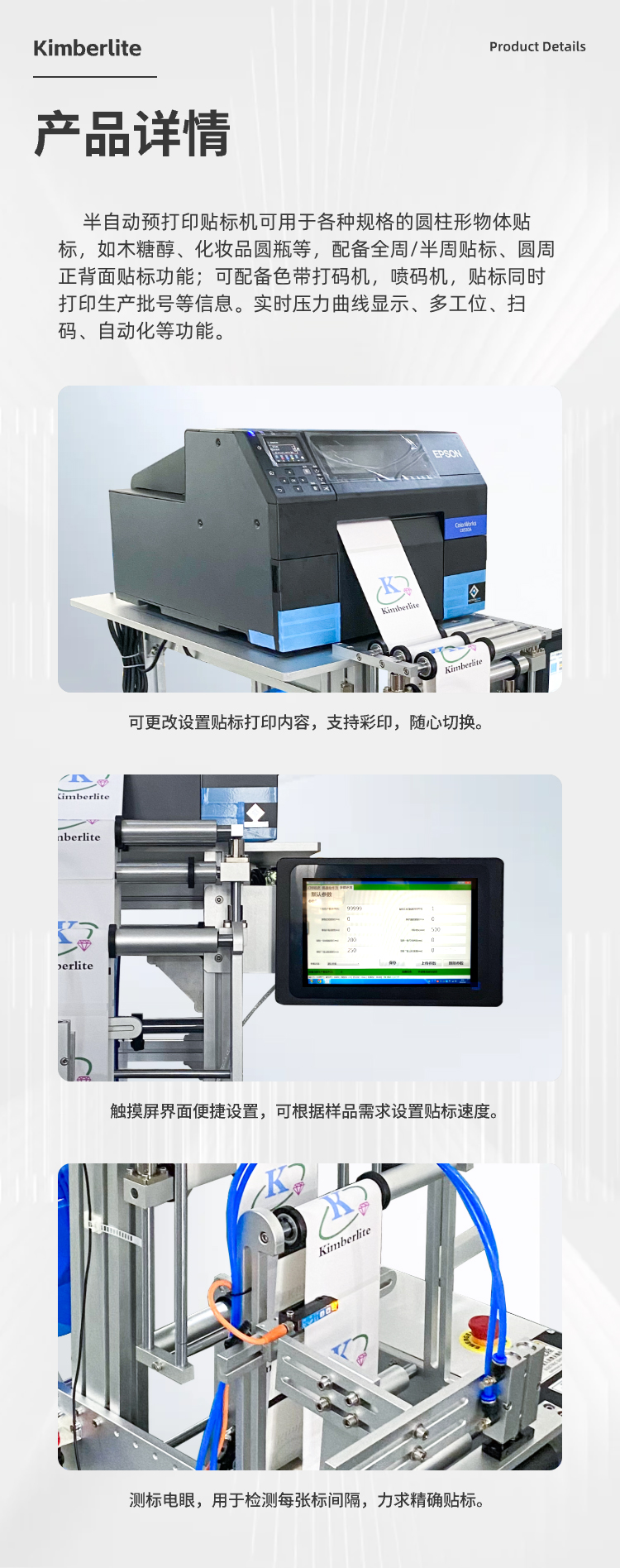 可用于各種規格的圓柱形物體貼標,如木糖醇、化妝品圓瓶等,配備全周/半周貼標、圓周正背面貼標 功能;可配備色帶打碼機,噴碼機,貼標同時打印生產批號等信息。